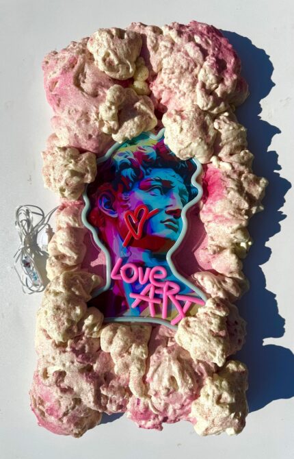 This isn’t just a canvas—it’s a dimensional experience. Melting clocks surge outward like liquid memories, while wild, sculpted clouds—formed from layers of multicolored spray foam—burst off the surface in a 6-inch-thick eruption of texture and color. Every detail, from insulation sheeting to leftover aerosol paint, is reborn into a delirious dreamscape where nothing stays still—not even time.